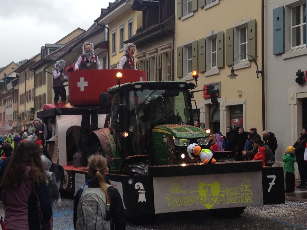 Letzte Woche fand bei stürmischem Wetter die Fasnacht in Laufen statt. Die ländliche „Buurefasnacht“ unterscheidet sich deutlich von der grossen Frau Fasnacht in Basel. In Laufen dominieren die Guggen und Wagen den Umzug. Ja, hier ist es ein Fasnachtsumzug, kein Cortège. Die Larven heissen Masken und die Räppli nennt man Confetti.